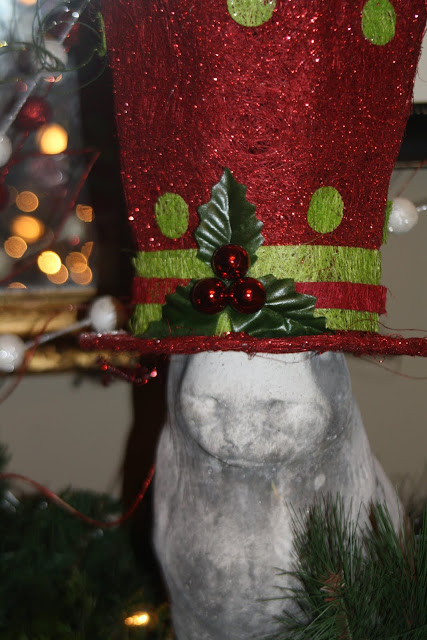 In the entry foyer I decorated in a Dr. Seuss style. I was inspired by a hat I saw at Ben Franklin. My stone statues are wearing one, as well as the tree!